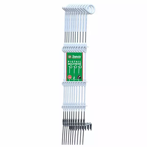 The Strainrite Pigtail Multiwire Post is a versatile and durable solution for temporary electric fencing, designed to simplify livestock management in rotational grazing systems for cattle, sheep, and goats. Constructed from 6mm galvanized spring steel, it features a hot-dip galvanized pressed steel foot for superior ground-holding strength, ensuring easy step-in installation and stability in various soil conditions. With a total length of 1040mm (41") and an out-of-ground height of 850mm (33.5"), the post includes five adjustable, UV-stabilized polypropylene insulator clips that securely hold multiple strands of polywire, polytape, or braid, preventing slippage and allowing flexible wire spacing. The “live-shaft” design maintains electrification along the shaft, repowering broken wires through parallel live wires, ensuring consistent fence performance. The tangle-free Dura-Top head reduces wire tangling and wear, enhancing durability and ease of use. Available in bundles of 10 and proudly made in New Zealand, the Strainrite Pigtail Multiwire Post offers farmers a reliable, low-maintenance, and efficient fencing solution for effective livestock containment.